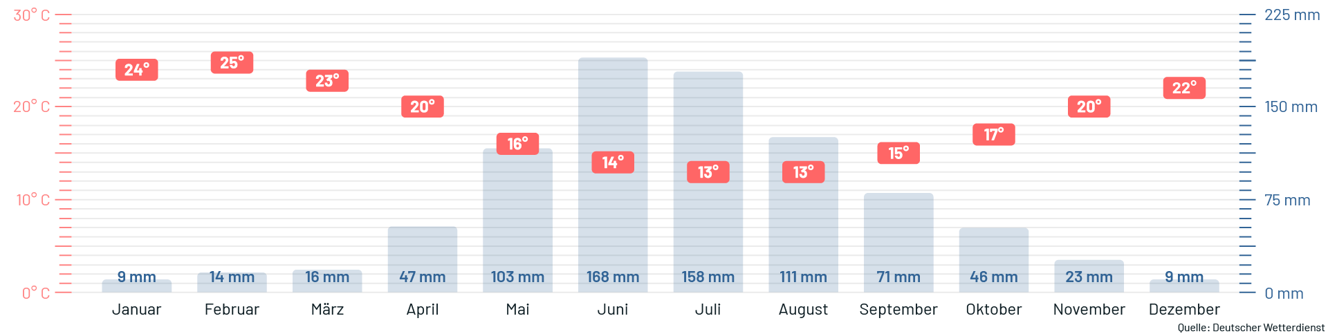Perth und Umgebung blühen in dieser mediterranen Trockenzeit richtig auf: Sonne pur, moderate Temperaturen und kaum Niederschlag laden zu entspannten Strandtagen in Fremantle, Weinproben im Margaret River oder Sightseeing in der lebendigen Hafenstadt ein. Sommer (Dezember bis Februar) bringen trockene Hitze und Strandflair, fordern aber durch Höchstwerte über 30°C bei Ausflügen manchmal die Ausdauer heraus.